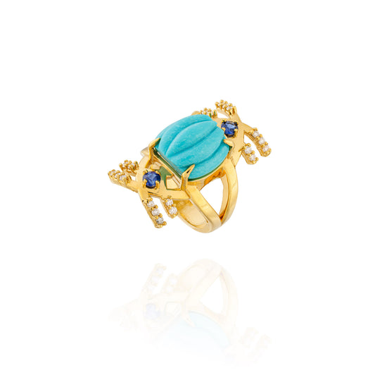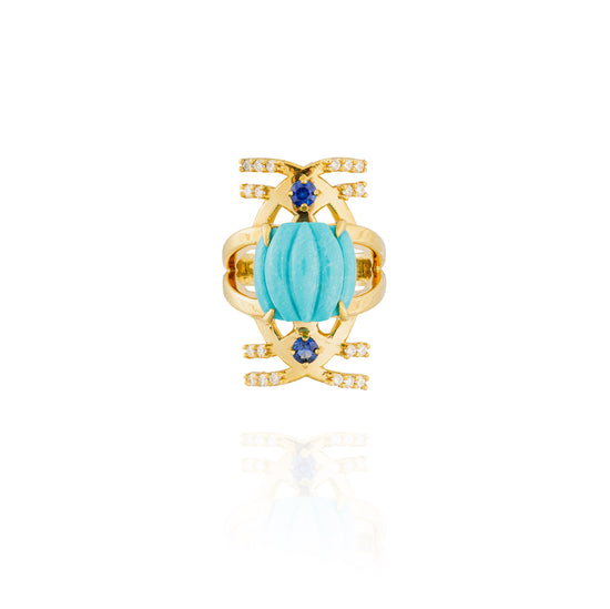 18K Yellow Gold Ring with Turquoise Cabochon, White Diamond (0.38 cts), and Blue Sapphire (0.38 cts).