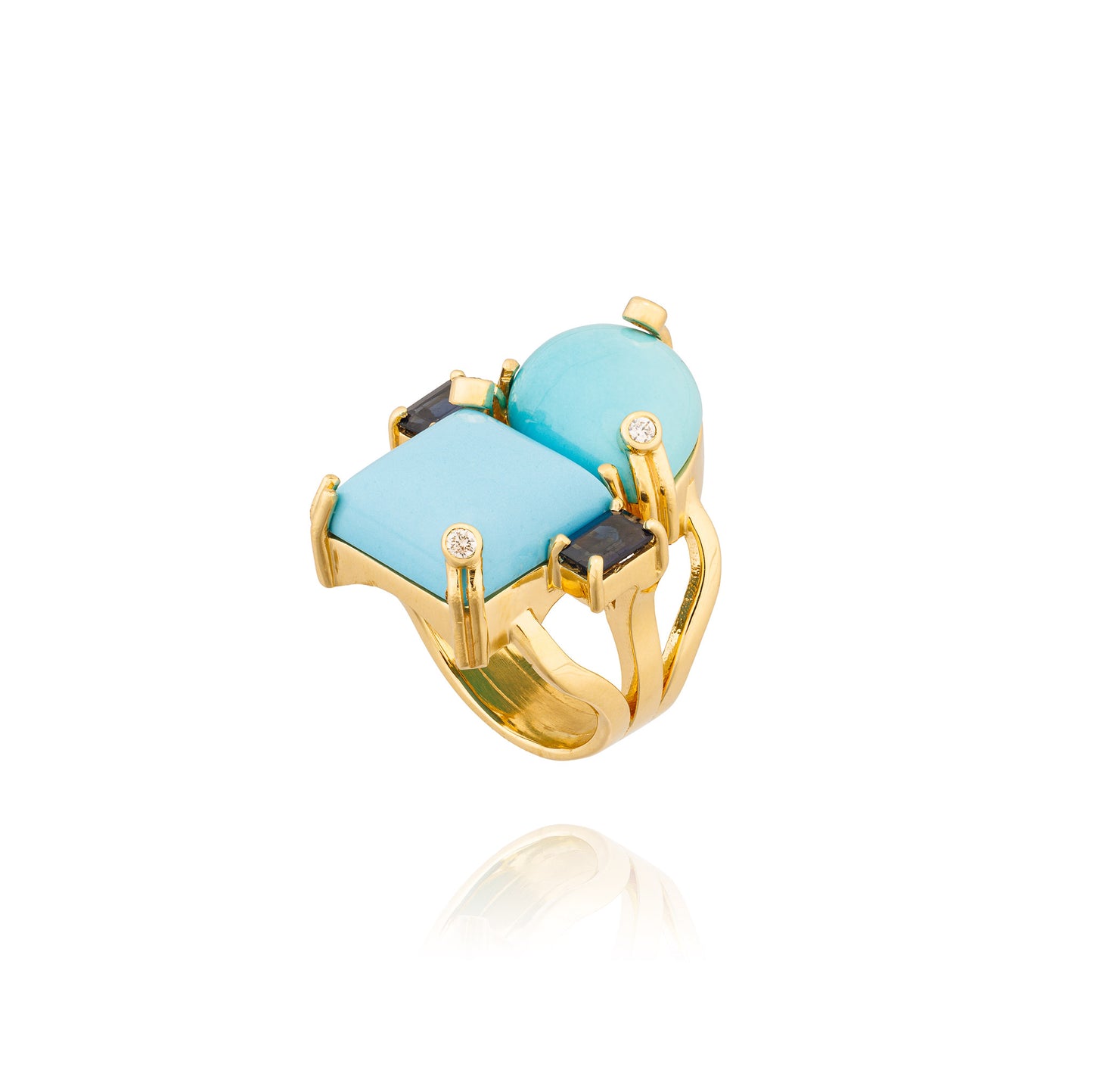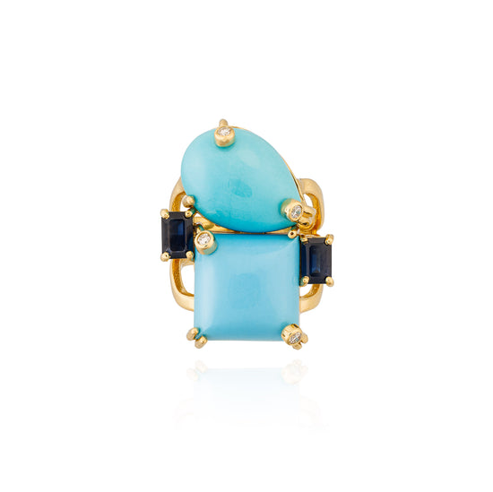 18K Yellow Gold Ring with Turquoise Cabochon, Blue Sapphire (1.33 cts), and Diamond (0.10 cts).
