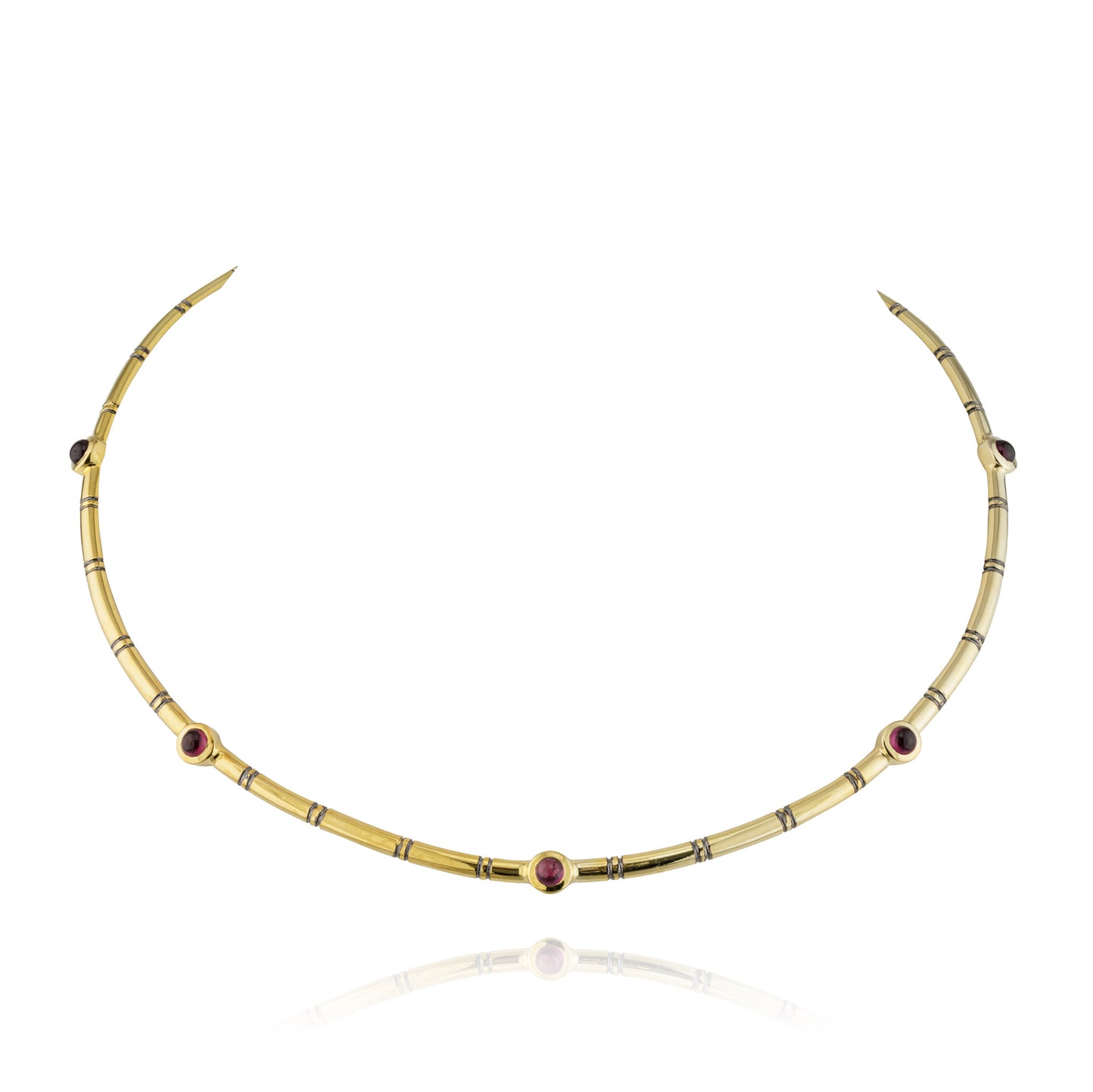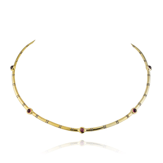 925 Silver Cuff Necklace Plated in 18K Yellow Gold with Round Rhodolite Cabochon.