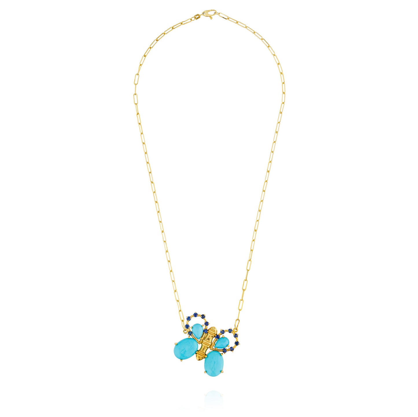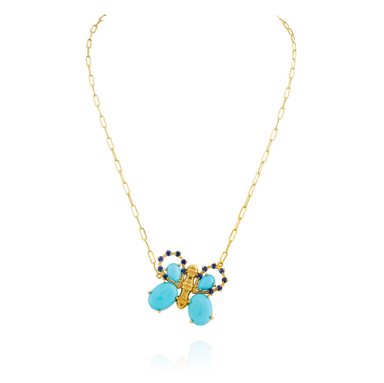 14K Yellow Gold Paper Clip Chain Necklace with an 18K Yellow Gold Butterfly Pendant with Turquoise (18.57 cts). and Blue Sapphire (1.56 cts).