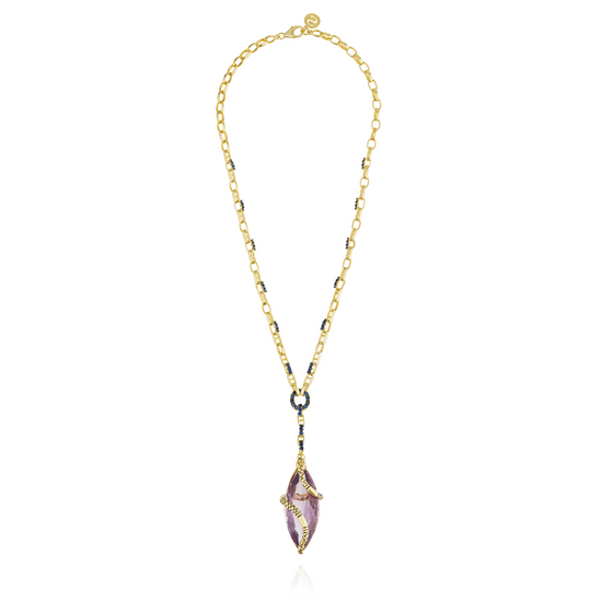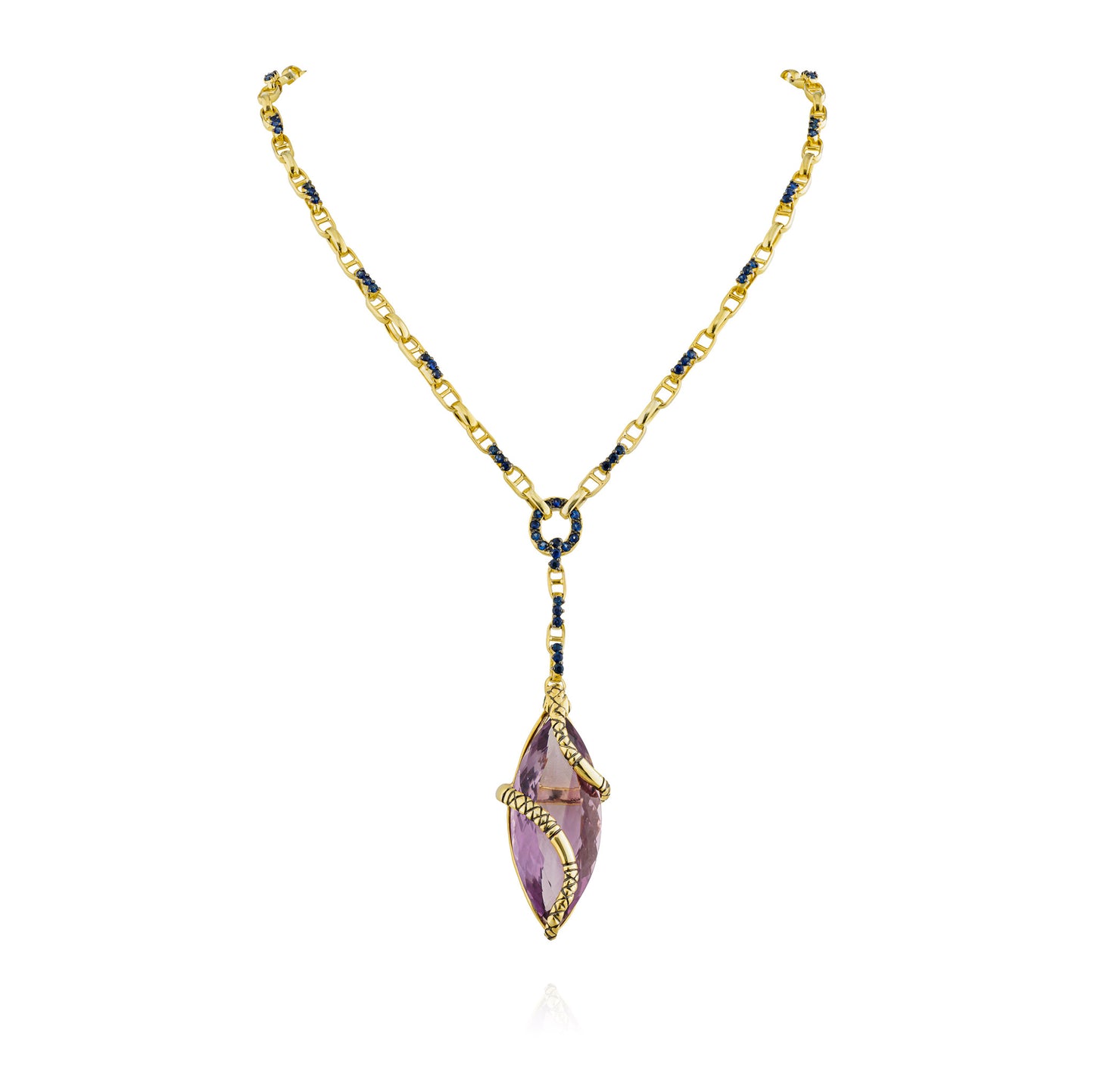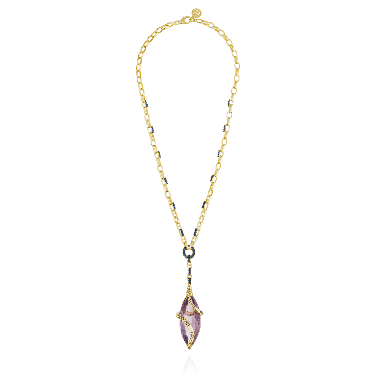 925 Silver Necklace Plated in 18K Yellow Gold with Faceted Amethyst (86.98 cts), Tsavorite (0.05 cts), and Blue Sapphire Pavé (4.27 cts).