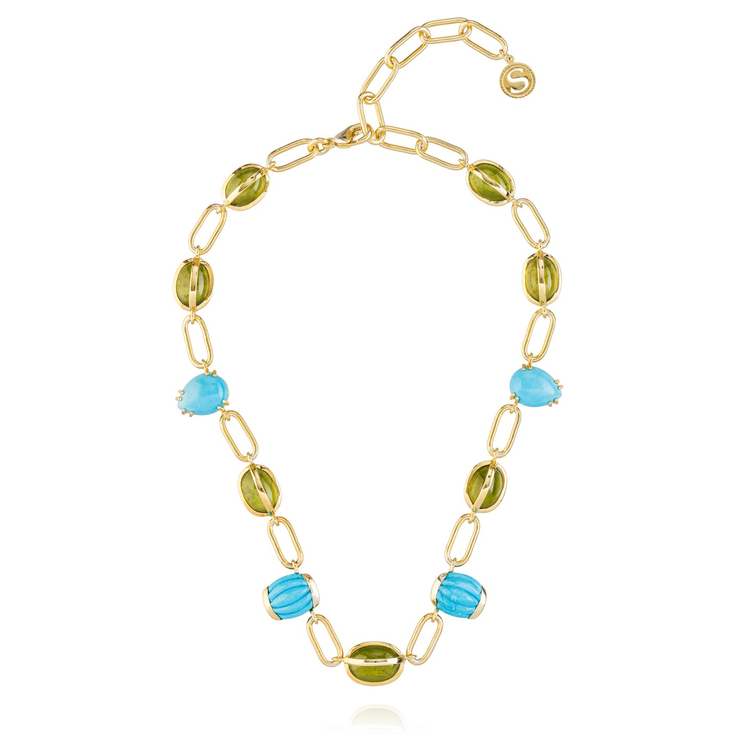925 Silver Necklace Plated in 18K Yellow Gold with Idocrase (60.8 cts) and Turquoise Cabochons.