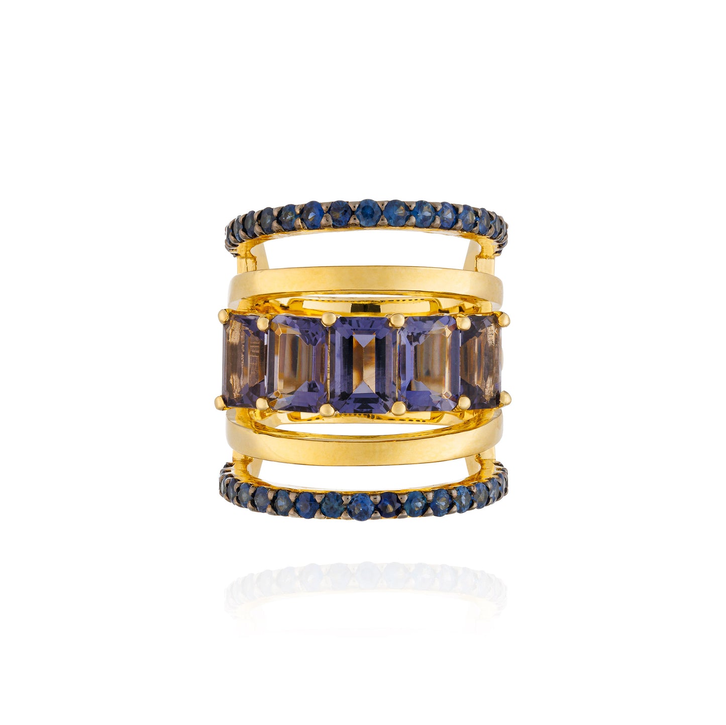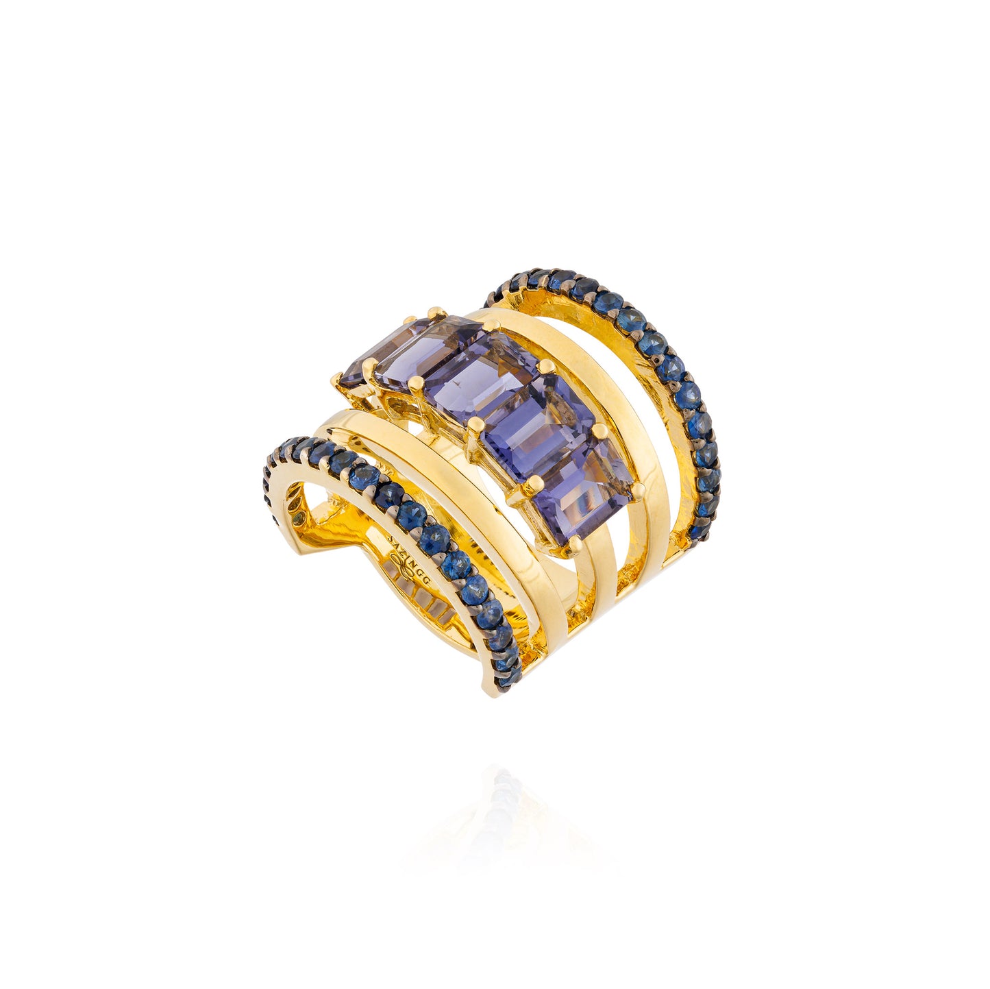 925 Silver Ring Plated in 18K Yellow Gold with Emerald Cut Iolite (4.40 cts), and Blue Sapphire (1.53 cts).