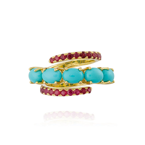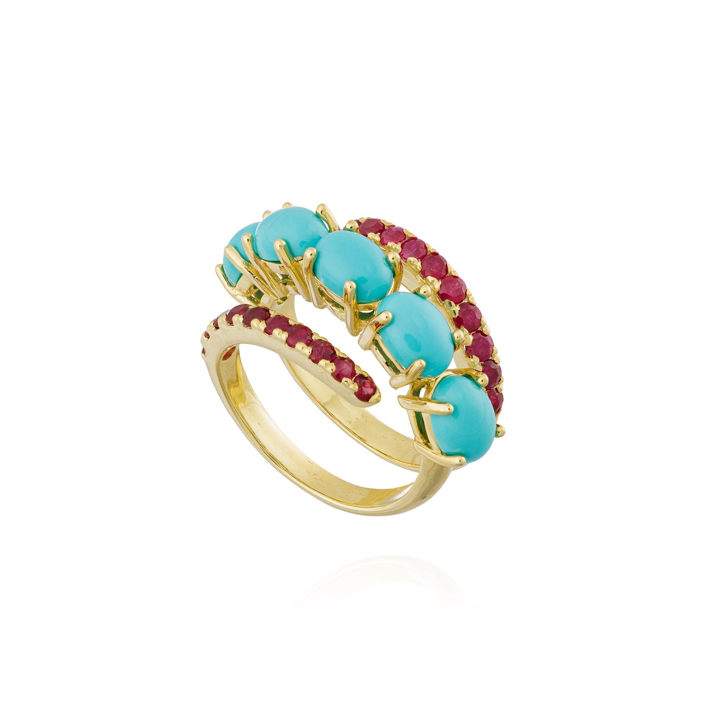 925 Silver Ring Plated in 18K Yellow Gold with Turquoise Cabochon and Faceted Ruby.