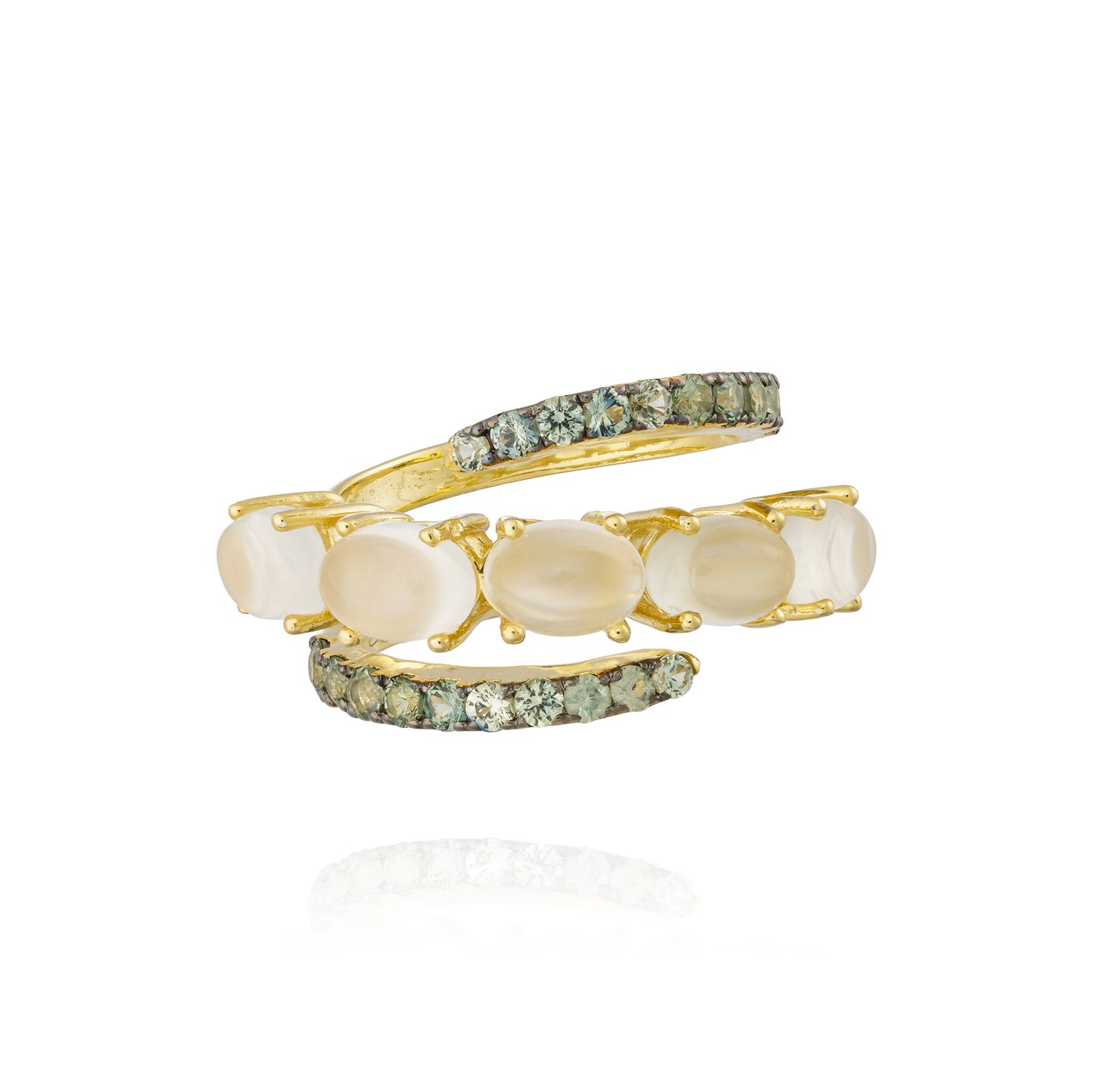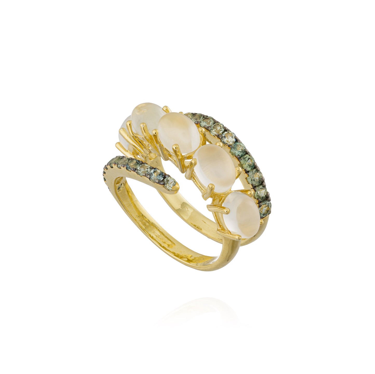 925 Silver Ring Plated in 18K Yellow Gold with Moonstone Cabochon and Faceted Green Sapphire.