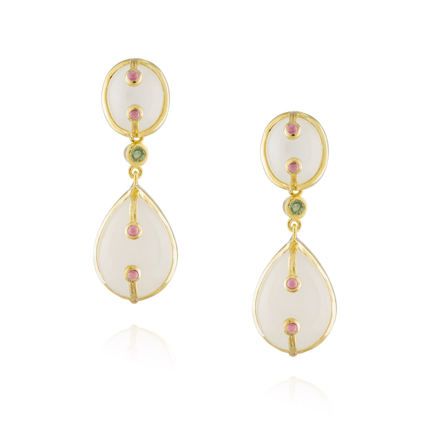 925 Silver Earrings Plated in 18K Yellow Gold with Moonstone (29.81 cts) Cabochon, Rhodochrosite, and Green Sapphire (0.31 cts).