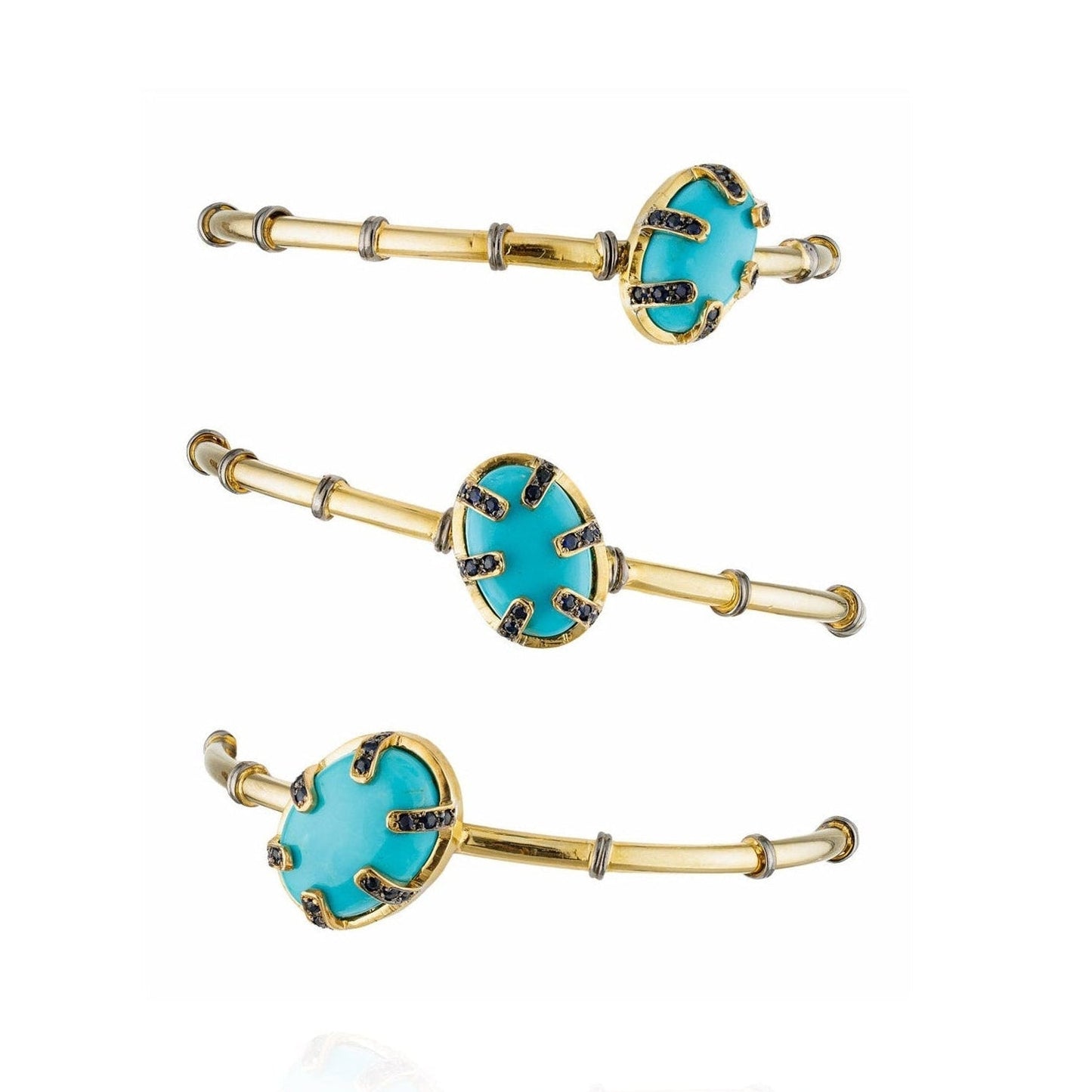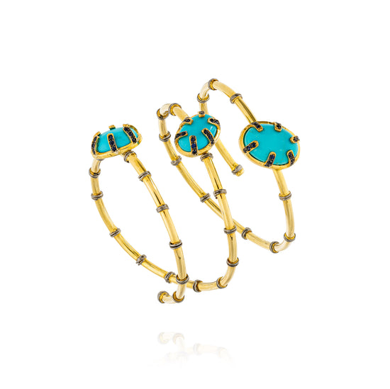 925 Silver Spiral Bangle Bracelet Plated in 18K Yellow Gold with Turquoise Cabochons, and Blue Sapphires (1.01 cts).